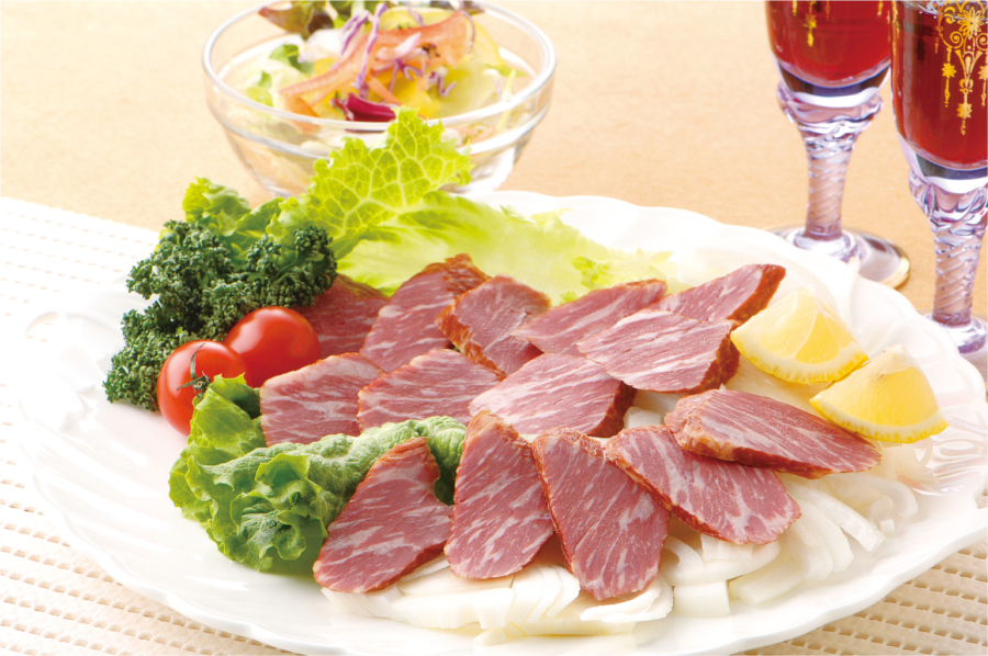 豊岡市出石町にあるハム工房「但馬の郷」では、豚肉を使用したハム・ソーセージの他にも兵庫県が誇る但馬牛を使った「但馬牛のくんせい(牛ハム)」を作っています。但馬牛モモ肉を熟成させた後、桜のチップで丹念に燻した燻製品は、但馬牛肉の持つ旨味や風味とスモークフレーバーが相まったバランスの良い一品です。経を小さく縦長にカットして、噛み応えのある食感とまろやかな味わいを楽しんでいただけます。