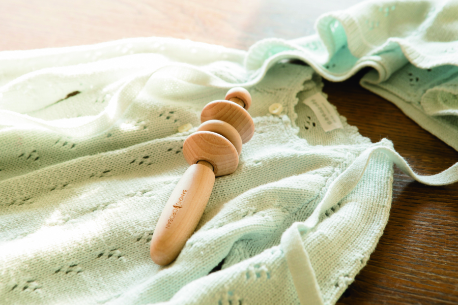 赤ちゃんが触ることにより玉が回る、振ることにより音が出る、赤ちゃんの考える力を養う知育木具です。播州そろばん屋ならではの技術を活かした仕上がりとなっております。