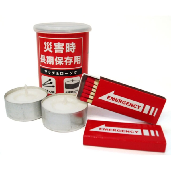 マッチ業界団体では、阪神淡路大震災の教訓を活かし、緊急避難時対策商品として「缶詰マッチ」を販売しています。防災拠点倉庫等での備蓄、自治体・学校・ご家庭の非常時持出用品などにご活用ください。プルトップ丸筒缶(ポリキャップ付)にマッチ(10本入)2箱・ローソク(台座付・4時間燃焼)2個入り。