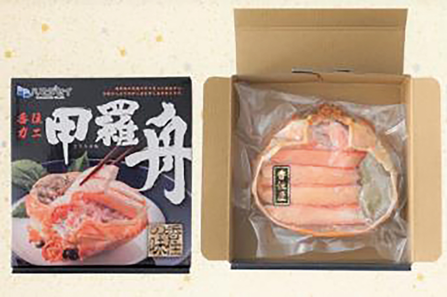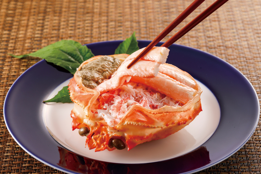 香住漁港で水揚げされた 「香住ガニ(ベニズワイガ ニ)」をたっぷり使用。甲 羅を舟に見立て、蟹のほぐ し身・棒身・濃厚な蟹みそ を美しく豪華に盛り付けま した。熟練の技で旨味を 余すことなく引出し、最新 の「プロトン冷凍」で解凍 後もみずみずしさを保ちま す。